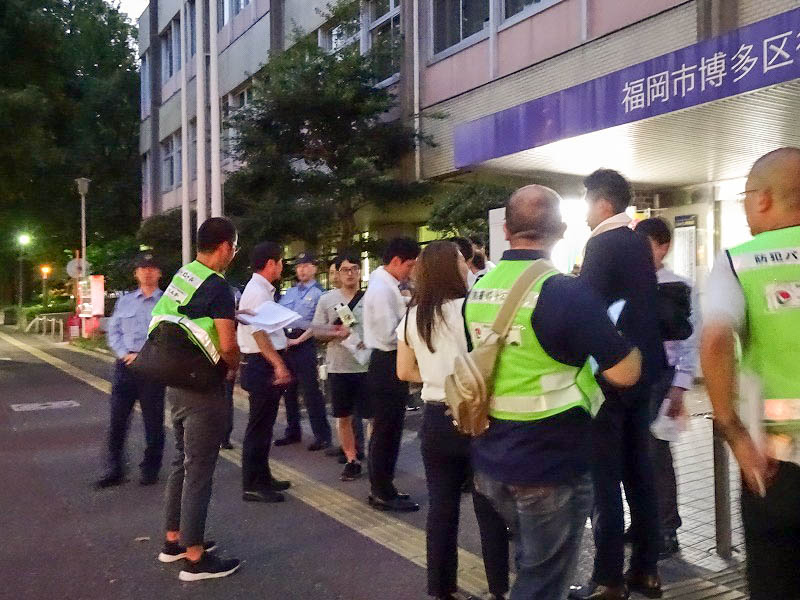 今年度1回目の青年部夜回りは博多支部担当となりました。人数もかなり集まりましたので今回は3チームにわかれて広範囲を博多署の生活安全課の方と一緒に夜回りしました。